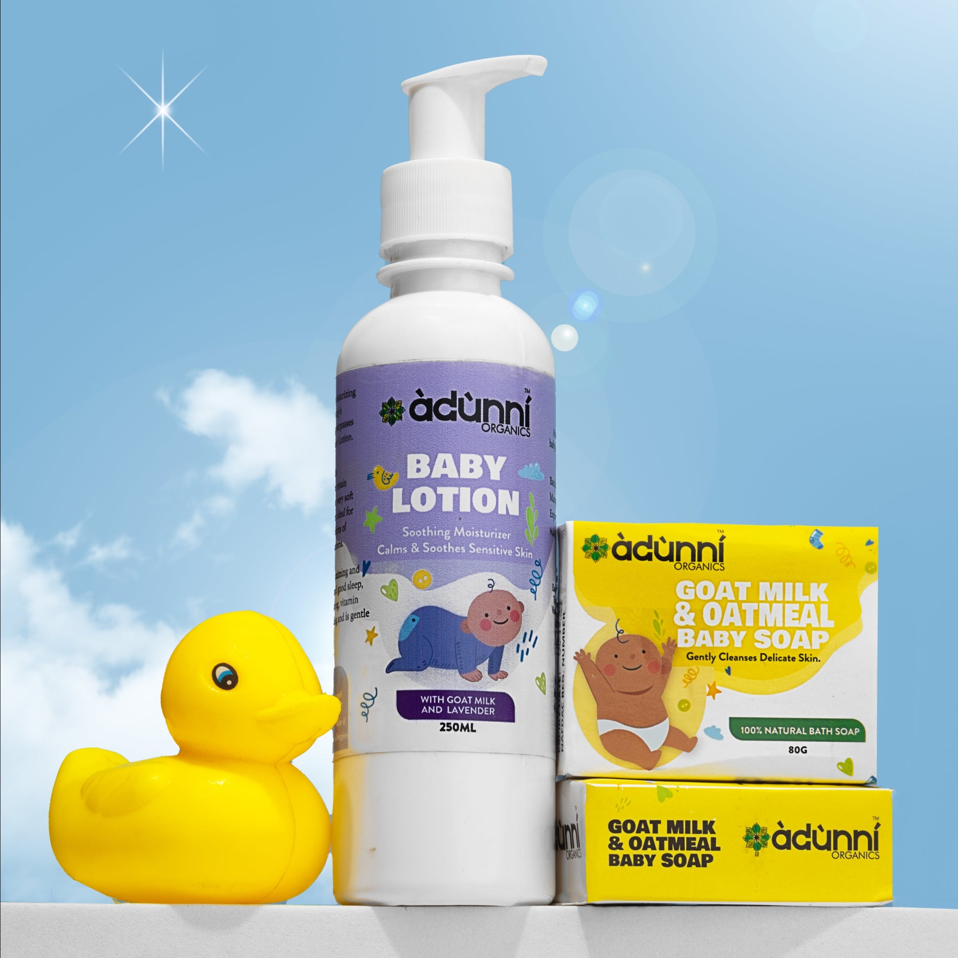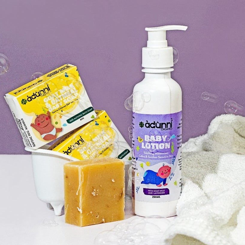 Baby Care Kit contains 2 bars of our Goat Milk and Oatmeal Baby Soap, and 1 Baby Lotion.