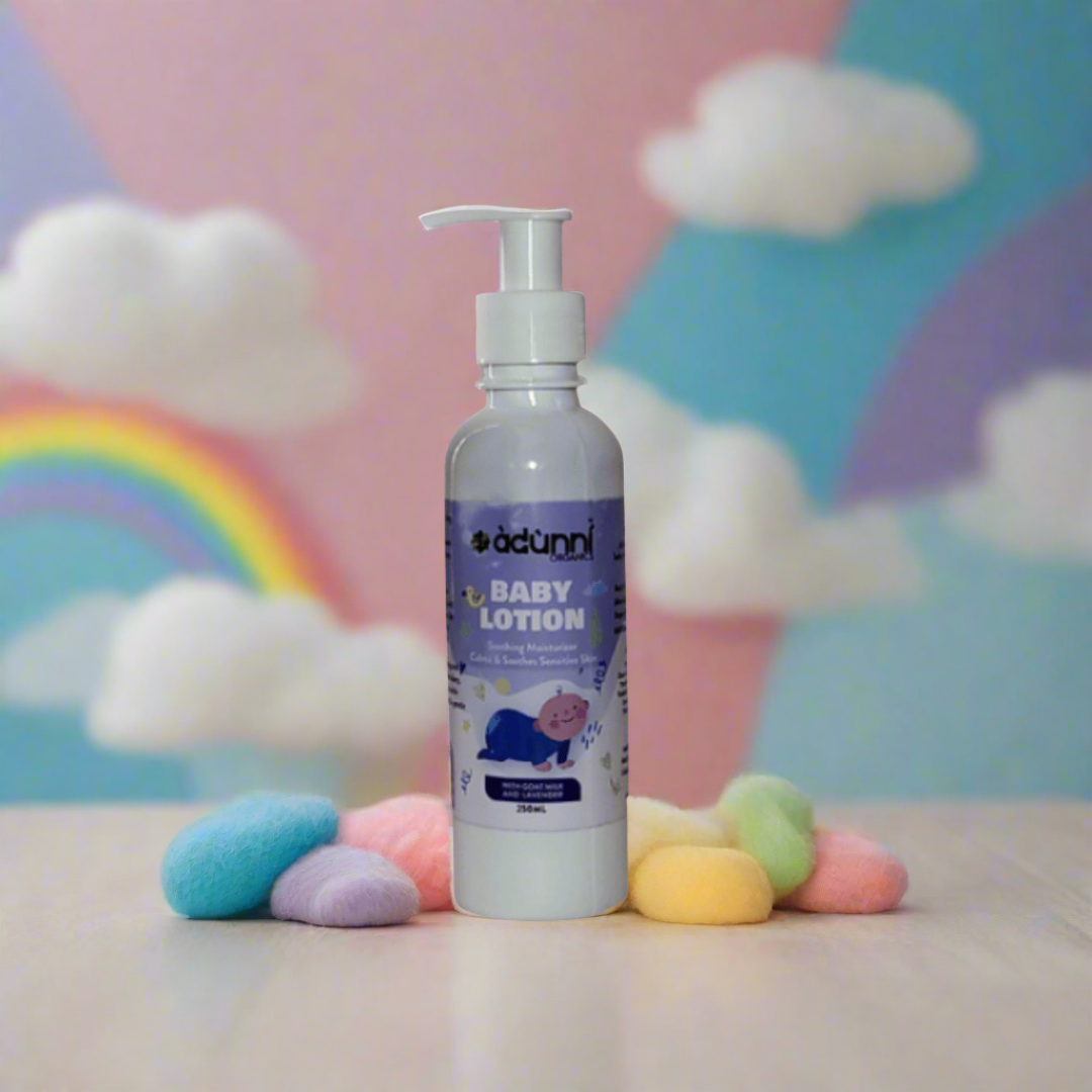 Our baby lotion is the best thing you can apply to your baby or child's skin to moisturize, soothe and protect it. It naturally nourishes the skin with vitamins A, D, E and K from within the dermal layers. It fades spots and scars gently, and because it is water based, it gives the skin an intense dose of hydration which is very important to keep skin healthy and supple regardless of harsh weather conditions giving the skin a healthy glow that is our signature at Adunni Organics.
