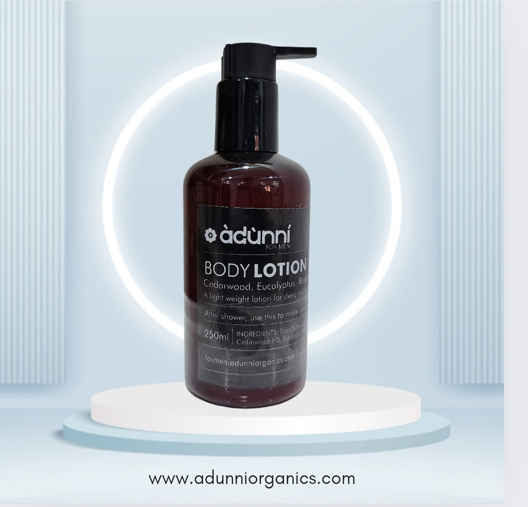 Men’s body lotion by Adunni Organics is a lightweight body lotion designed to moisturize. soften, brighten and smoothen male skin.