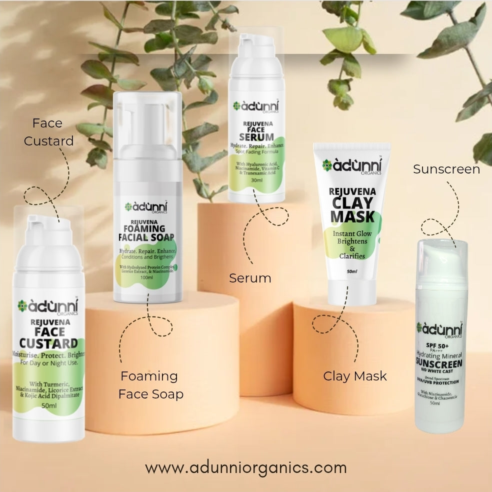 The kit contains 1, Foaming Face Soap, 1 Clay Mask, 1 Facial Serum and 1 Face Custard.